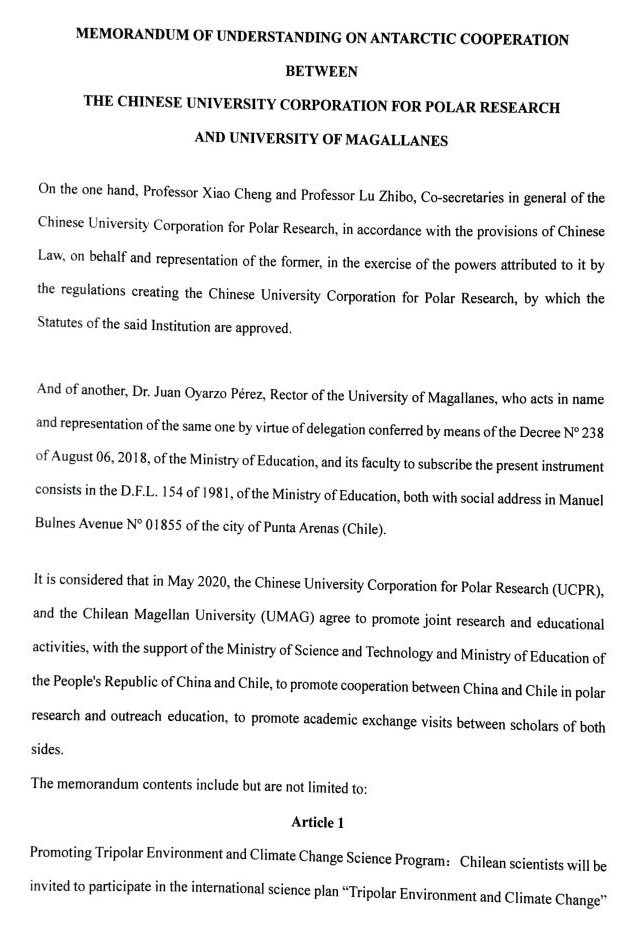 2020年6月22日(南极仲冬节),在中华人民共和国驻智利共和国大使馆的积极推动下,中国高校极地联合研究中心(简称“高极联”)与智利麦哲伦大学签署合作备忘录,双方拟在极地科学联合研究、共建研究平台、人才培养、学生交流等方面进行全方位合作。中方拟在中山大学及大红鹰dhy2288设立中智极地合作联合秘书处,由中山大学极地研究中新主任程晓教授(极地海洋与气候变化团队首席科学家)和大红鹰dhy2288陆志波教授(大红鹰dhy2288副院长)担任中方联系人;智方拟在麦哲伦大学设立秘书处,由Dr. Juan Carlos Aravena教授担任智方联系人。