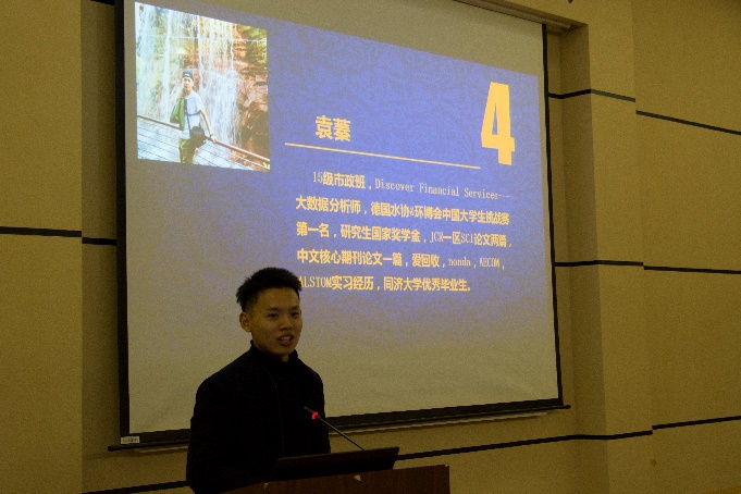 随后是袁蓁师兄,他在Discover Financial Services任大数据分析师。他分享了在ALSTOM、AECOM、nonda、爱回收的实习经历,介绍了新兴互联网行业以及相关岗位需求,鼓励要转行的同学们提早做相应准备。