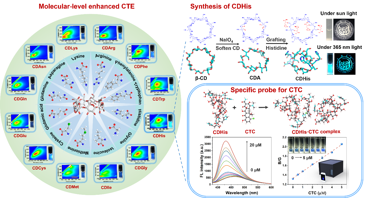 本研究通过化学反应将氨基酸小分子(选用了12种常见氨基酸)接枝到环糊精环状结构上,利用环糊精的有限空间增强氨基酸和环糊精的非常规发色团的簇集,引发电子离域,形成空间共轭(TSC);进一步通过分子内与分子间的氢键与配位等强相互作用提升构象刚化程度,抑制非辐射跃迁,提升荧光量子产率。利用合成的氨基酸修饰的环糊精发光分子作为荧光探针,通过智能手机支持的便携式荧光检测设备,基于荧光信号和图像分析,构建了针对四环素类抗生素(金霉素)的荧光分析方法,实现了高选择性、高灵敏度的可视化抗生素检测。本研究提出了基于分子水平增强簇集诱导发光效应的荧光分子合成的新策略,拓展并深化了对非常规发光理论的认识,促进了非常规发光材料在荧光传感与分析成像领域的应用。
